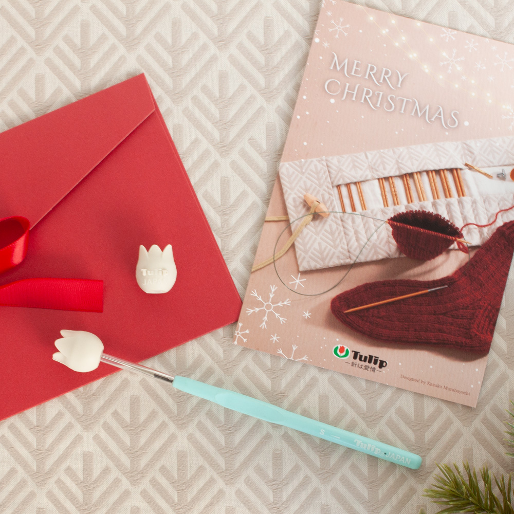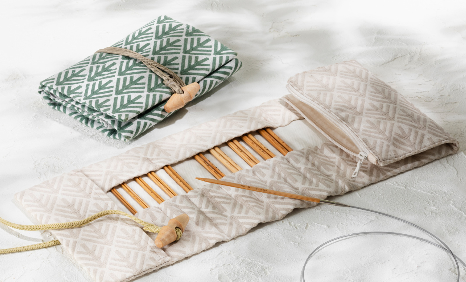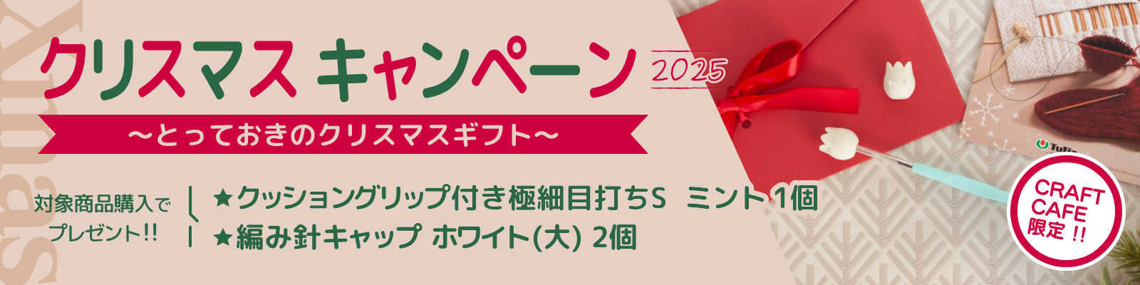 期間中「キャリーシー ロング 切り替え式竹輪針セット Komorebi ベージュ/グリーン」購入につき、「クッショングリップ付き極細目打ちS ミント 1個/編み針キャップ ホワイト(大) 2個」プレゼント